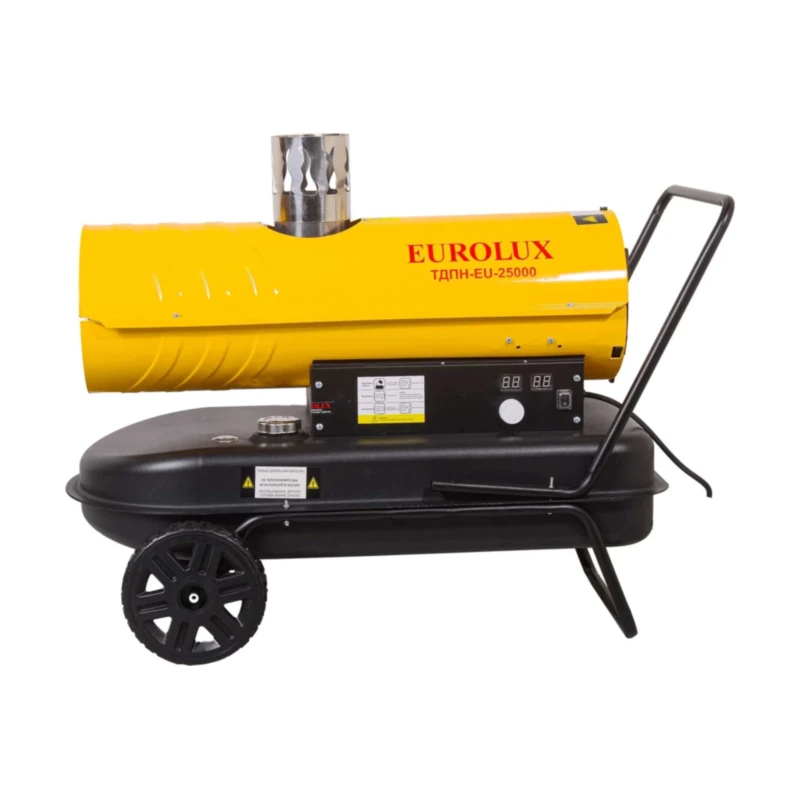 Eurolux ТДПН-EU-25000 подходит для экономичного и быстрого обогрева помещений большой площади. Мощность дизельной теплопушки составляет 25 кВт. При этом её производительность достигает 1000 м³/ч, а расход топлива – 1,65 кг/ч. Благодаря непрямому нагреву пушка также подходит для эксплуатации в помещениях с людьми. Для этого необходимо снабдить её системой отвода отработанных газов.