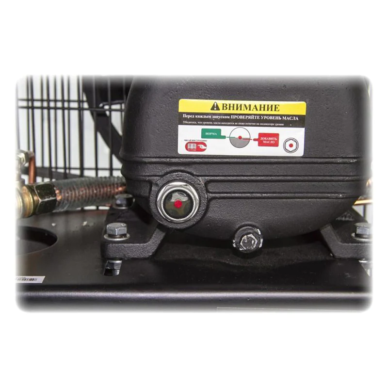 Для защиты от загрязнений воздух поступает к нагнетательной головке компрессора через фильтр. Смазка уменьшает износ элементов поршневого механизма. Термозащита предотвращает перегрев двигателя. Уровень масла в картере удобно отслеживать через смотровое окно с разметкой. Вы можете контролировать давление в ресивере и на выходе с помощью двух манометров.