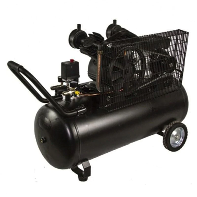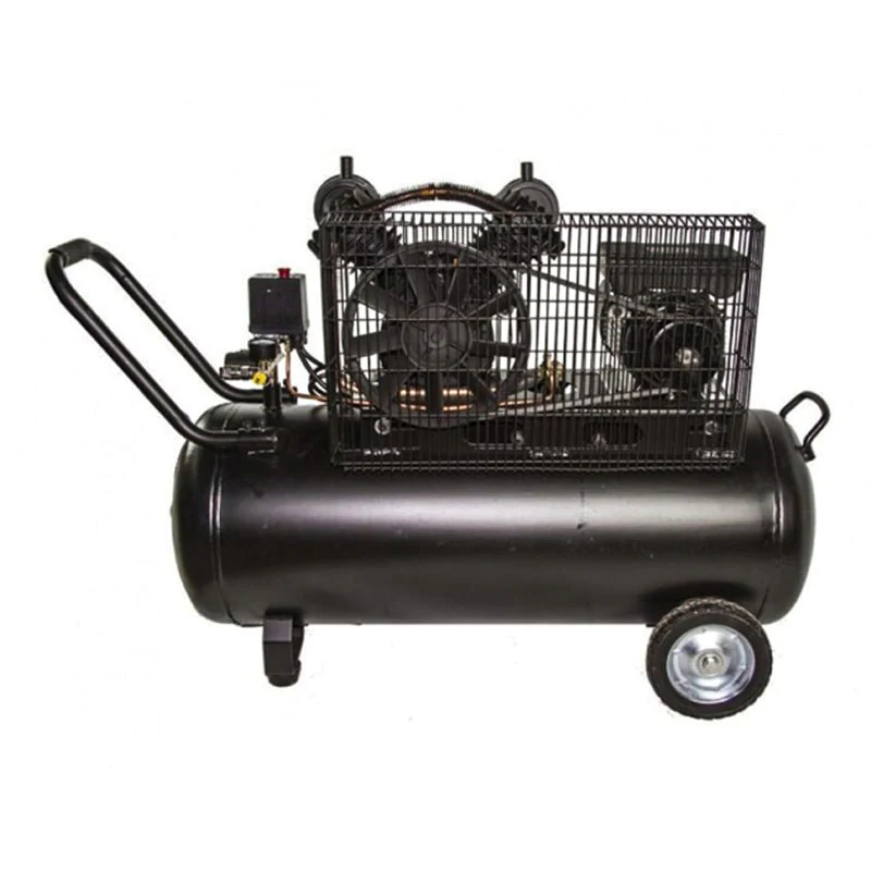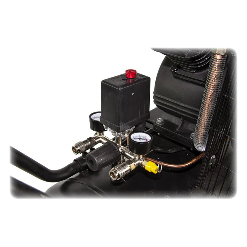 Двухцилиндровый одноступенчатый масляный компрессор оснащен V-образной поршневой группой, которую приводит в действие электродвигатель мощностью 2,2 кВт. Ременная передача способствует более плавному пуску, поддерживает высокий КПД при сравнительно низких оборотах, улучшает тепловой и нагрузочный режимы двигателя. Передаточное колесо выполнено в виде крыльчатки для дополнительного охлаждения поршневой группы. Оребрение головок цилиндров и воздухопровода улучшает теплоотдачу. В нижней части ресивера с антикоррозионным полимерным покрытием предусмотрена пробка для слива конденсата.