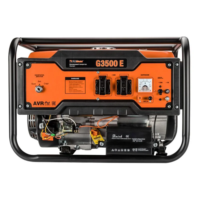 FoxWeld Standart G3500 E - простой и надёжный в применении резервный источник питания на силовой раме классической компоновки для стационарного использования. Предназначен для обеспечения резервным электричеством бытовых приборов. Оборудован электрозапуском (запуском с ключа). Может обеспечить светом и электричеством небольшой загородный дом во время его отключения от основной электросети.
