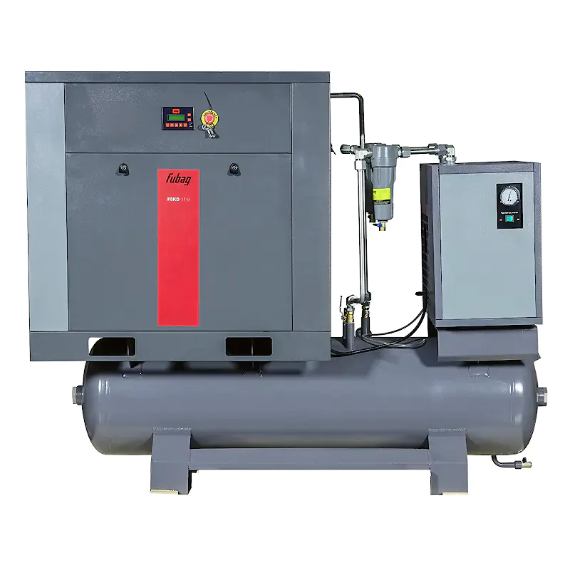 Винтовой компрессор FUBAG FSKD 11-8/270 представляет собой универсальное решение для получения технически сухого сжатого воздуха. Комплектация включает в себя воздушный ресивер, рефрижераторный осушитель и два линейных фильтра.