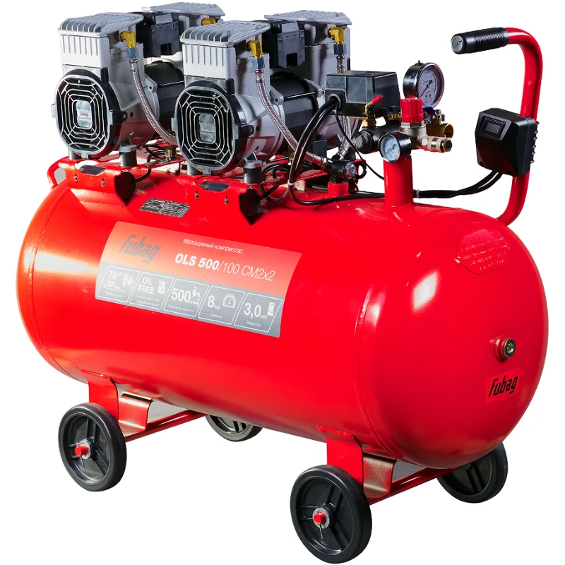 Компрессор FUBAG OLS 500/100 CM2x2 — это безмасляная, малошумная модель, разработанная для подачи чистого воздуха без масляных примесей, что делает её отличным выбором для покрасочных работ, автосервисов и небольших мастерских.