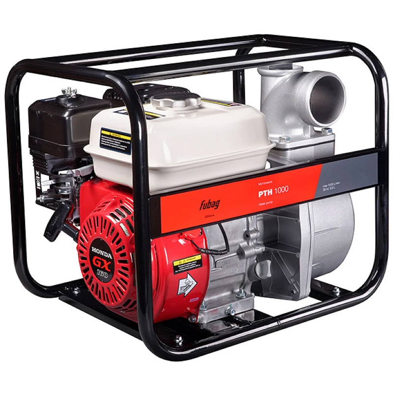 Мощная мотопомпа FUBAG PTH 1000 — надёжное решение для перекачивания чистой воды, осушения подвальных помещений и строительных котлованов, а также для сельскохозяйственных нужд. Оснащенная 4-тактным OHV-двигателем Honda GX160 мощностью 2,9 кВт (3,8 л.с.) и ёмкостью топливного бака 3,6 л, она обеспечивает производительность до 1000 л/мин (60 м³/ч) при максимальной высоте напора 28 м и высоте всасывания до 8 м.