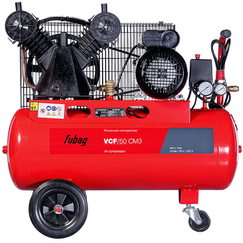 Надёжный и мощный компрессор FUBAG VCF/50 CM3 с ресивером объёмом 50 л предназначен для эффективной работы с любым пневмоинструментом в строительстве и ремонте. Благодаря ременному одноступенчатому типу компрессора и асинхронному альтернатору с мощностью 2,2 кВт, устройство обеспечивает производительность до 440 л/мин при рабочем давлении 10 бар. Частота вращения составляет 1100 об/мин, что гарантирует стабильную и интенсивную работу на протяжении всей смены.