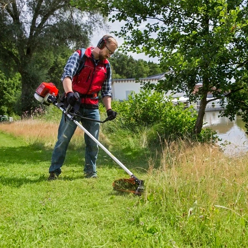 Мотокоса оборудована двухтактным двигателем мощностью 3 л.с., который легко заводится с помощью ручного стартера. Остановка мотора производится одним нажатием кнопки, удобно расположенной под правой рукой на рукоятке. Выключатель подпружинен и возвращается во включенное состояние, поэтому бензиновый триммер Geos всегда готов к запуску. Ширина обработки леской составляет 41 см, ножом — 25 см.