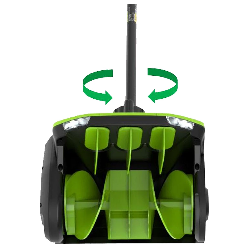 Бесщеточный двигатель отличается экономным расходом заряда аккумулятора и не требует обслуживания. В случае перегрева или чрезмерной нагрузки происходит его автоматическое выключение во избежание поломки. Ручка переключателя на козырьке лопаты позволяет менять направление выброса снежной массы за счет поворота секций снегоуборочного механизма на 30º вправо или влево. Шнек изготовлен из прочного пластика, устойчивого к морозам и не повреждающего декоративное дорожное покрытие. Со снегоуборщиком Greenworks GD40SS2 удобно работать в темное время суток: ранним зимним утром или вечером. При запуске двигателя на ковше автоматически включаются яркие светодиодные фары, обеспечивающие подсветку зоны уборки.