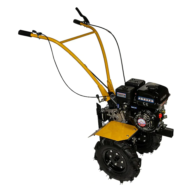 Бензиновый мотоблок оборудован рулем, который можно установить на удобный уровень высоты. На рукоятках расположены все основные элементы управления: сцепление, регулировка оборотов двигателя, переключение передач. Ручка реверса позволяет включить задний ход, обеспечивающий маневренность мотоблока. На первой скорости рекомендуется проводить вспашку целины, тяжелых и глинистых почв, на второй — культивирование рыхлой и легкой земли. Глубину вспашки легко регулировать путем перемещения сошника вверх-вниз и фиксации его при помощи шплинта и цилиндрического пальца.