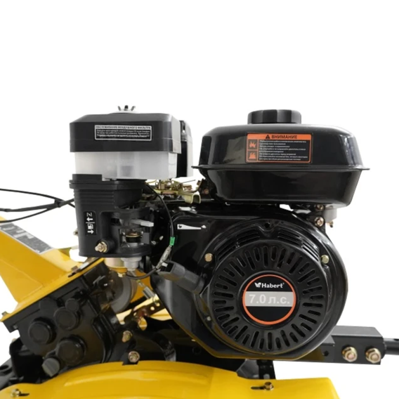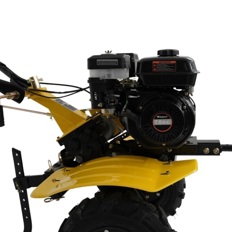В качестве силового агрегата на мотоблоке используется четырехтактный бензиновый двигатель Habert HB170F с мощностью 7 л.с. Надёжный двигатель обеспечивает бесперебойную работу при интенсивном использовании, а установленный датчик уровня масла предотвращает повреждение двигателя при понижении уровня масла в картере ниже необходимого. Применяемый на двигателе воздушный фильтр с масляной ванной даёт лучшую фильтрацию воздушного потока, что благоприятно сказывается на ресурсе двигателя.