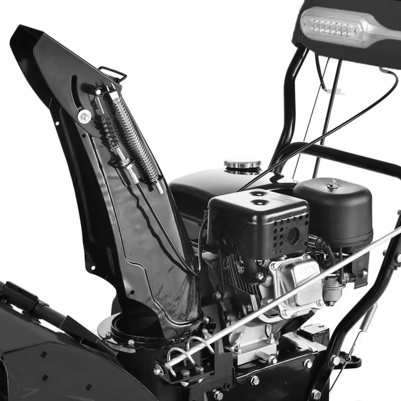 Снегоуборщик отлично справляется с задачами на различных типах поверхностей. Направление выброса снега можно регулировать в двух плоскостях, а LED-фара обеспечивает хорошую видимость при работе в тёмное время.