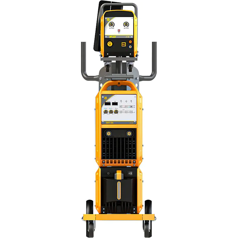 Сварочный полуавтомат Hugong EMIG 500 III – аппарат для работы в режимах MIG/MAG и ММА. Сварочный ток регулируется до максимального показателя 500 А. Модель сделана на базе инверторных транзисторов IGBT. Поставляется в комплекте с тележкой, системой плавной подачи проволоки, сварочной горелкой HG MIG-5, подающим рукавом, а также кабелями, газовым шлангом и роликами.