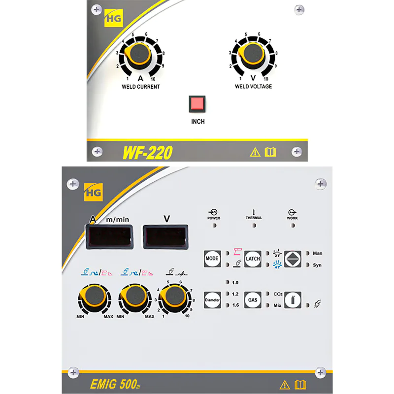 Сварочный аппарат поддерживает синергетическое управление при работе проволокой. Достаточно задать только желаемую скорость подачи проволоки, а напряжение будет подобрано автоматически.