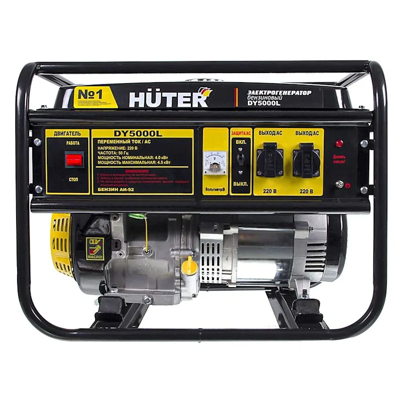 Бензиновый генератор Huter DY5000L способен питать однофазные приборы общей мощностью в 4 кВт. Его также можно использовать как резервный источник энергии. Защита от перегрузки и контроль недостатка масла повышают срок службы аппарата. А керамическое покрытие на поршне оберегает двигатель от преждевременного износа и образования нагара от плохого горючего.
