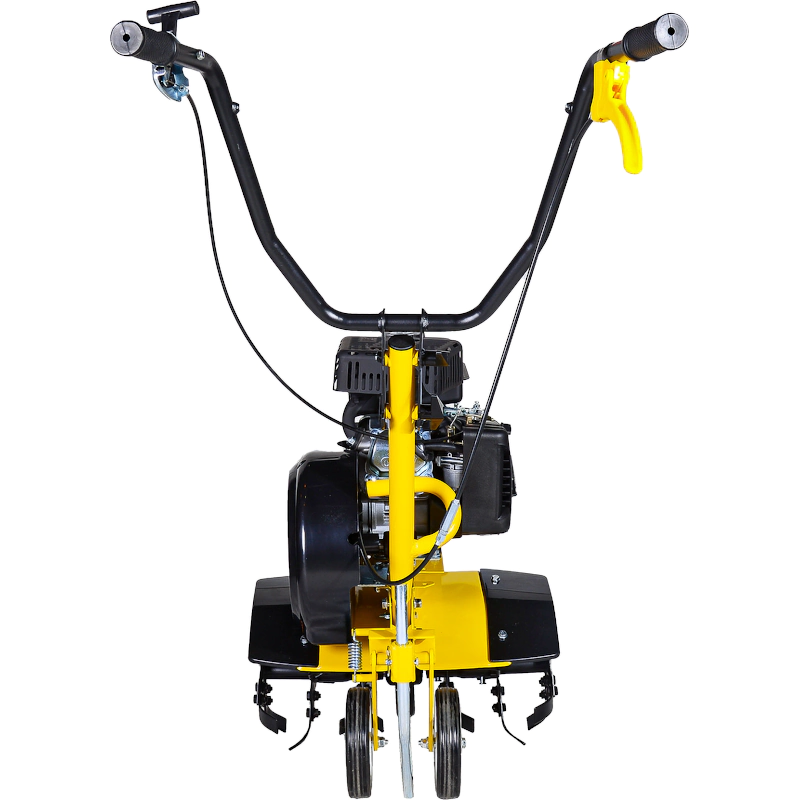 Агрегат оснащен цепным редуктором, который обеспечивает надежность эксплуатации, а датчик масла предупреждает от поломки двигателя, связанные с масленным голоданием. Элементы управления расположены на рукоятках, а сами ручки имеют резиновые накладки, которые гарантируют надежное удержание и предупреждают скольжение рук.