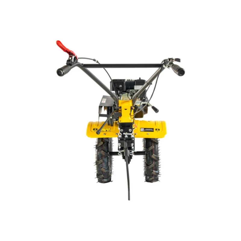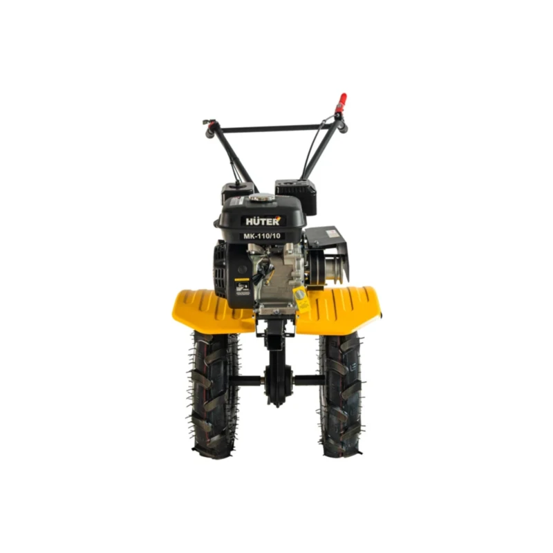 Особое внимание уделено удобству перемещения и безопасности оператора. Широкие колёса размера 4×10 дюймов оснащены агрессивным протектором, предотвращающим застревание машины в мягких почвах. Защитные крылья помогают избежать раскидывания почвы в сторону оператора во время обработки территории.