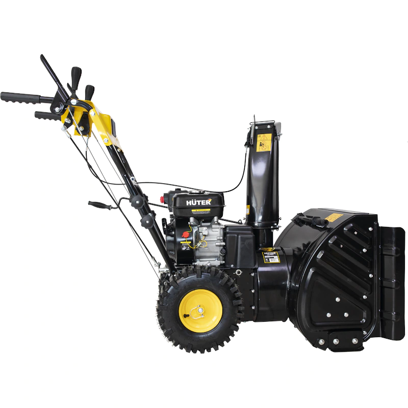 Снегоочиститель оснащен мощным двигателем Huter объемом 244 см³, что обеспечивает его высокую производительность. Максимальная дальность отбрасывания снега составляет 15 м, направление и угол выброса легко регулируются рычагами на панели оператора.