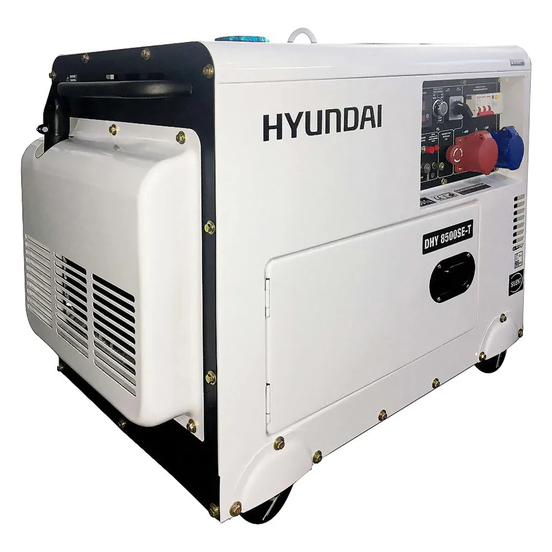 Звукоизолирующий кожух электрогенератора Hyundai DHY 8500SE-T позволил снизить шум во время работы до 72 дБ на расстоянии 7 м – генератор комфортно использовать. Устройство заключено в прочный стальной корпус для надёжной защиты от физического воздействия, погодных осадков. Наличие шасси позволит легко перевезти генератор в другое место, несмотря на большой вес.