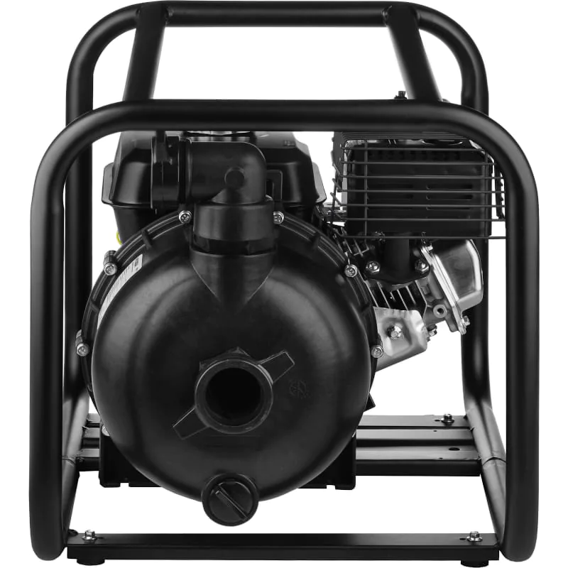 Корпус мотопомпы HYUNDAI HYA 53 сделан из армированного технополимера. Такой материал не подвергается окислению, устойчив к абразивному износу. Двигатель и насос защищены прочной стальной рамой. Она предотвращает поломку аппарата при транспортировке. Низ рамы служит устойчивым основанием, а верхняя часть образует рукоятки для переноски.