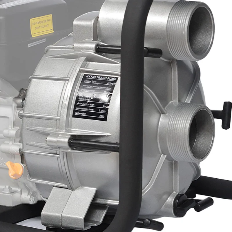 Диаметр входного и выходного отверстий мотонасоса Hyundai HYT 80 составляет 80 мм. Вы можете подключать к аппарату как простые бытовые шланги, так и пожарные рукава или иные спецсредства.