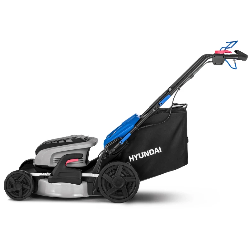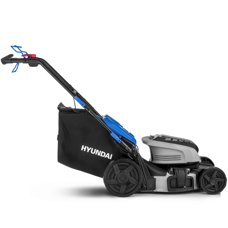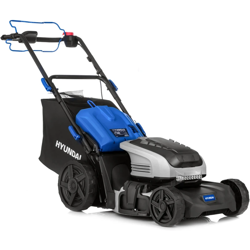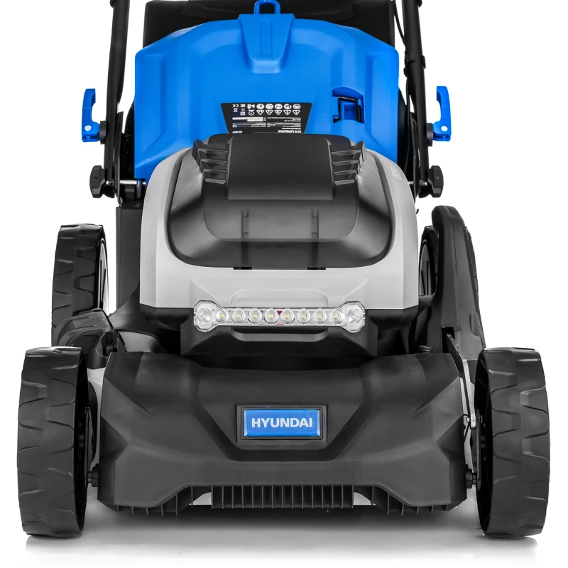Самоходная машина имеет удобные элементы управления и наглядную индикацию, показывающую скорость движения и уровень заряда. Ключ безопасности защищает от случайного включения. Аккумуляторная газонокосилка Hyundai поддерживает четыре режима работы: сбор травы в большой контейнер, мульчирование выброс назад и в сторону. Центральная регулировка высоты скашивания позволяет быстро поднимать и опускать деку с ножом посредством перестановки одного рычага. Яркая фара освещает газон, повышая удобство работы в сумерках.