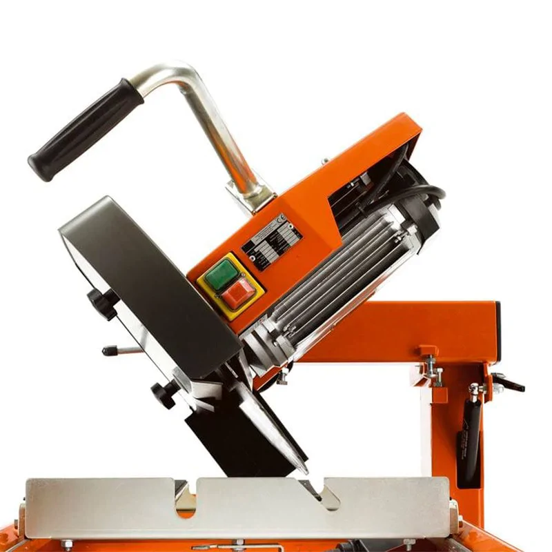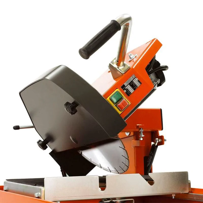 Электрический плиткорез работает от сети с напряжением 230 В, оснащен асинхронным двигателем мощностью 2200 Вт и самовсасывающим насосом. Вода распыляется на диск сразу после запуска мотора, обеспечивая охлаждение контактирующих частей и снижая содержание пыли в воздухе. Изменение глубины резки и наклона пильной головы выполняется при помощи рычагов и рукояток, без применения дополнительных инструментов. За счет съемной поворотной направляющей вы можете производить обработку в нескольких положениях от 45º до 90º.