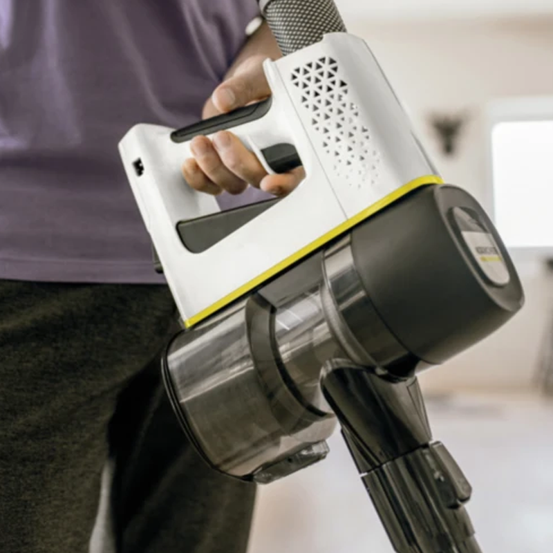 Прибор работает на аккумуляторе емкостью 2,5 Ач. Одного заряда хватает на полчаса. Этого времени достаточно, чтобы пропылесосить ковры, полы и мебель в небольшой квартире. Вы можете максимально увеличить мощность всасывания, нажав кнопку Boost. В этом режиме вертикальный пылесос Karcher VC 4 Cordless myHome Car работает в течение 18 минут. Светодиодные индикаторы на корпусе информируют о состоянии аккумулятора.