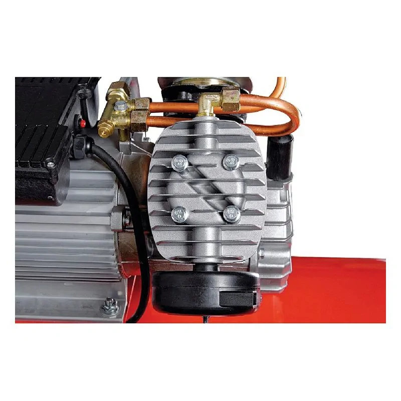 Масляный компрессор оснащен однофазным электродвигателем мощностью 2,2 кВт с теплозащитой. Алюминиевые компрессорные головки VDC с увеличенными ребрами обеспечивают быстрый отвод тепла от двигателя, чугунные цилиндры повышают КПД. Литой чугунный вал динамически сбалансирован для снижения вибрации.