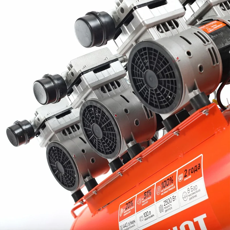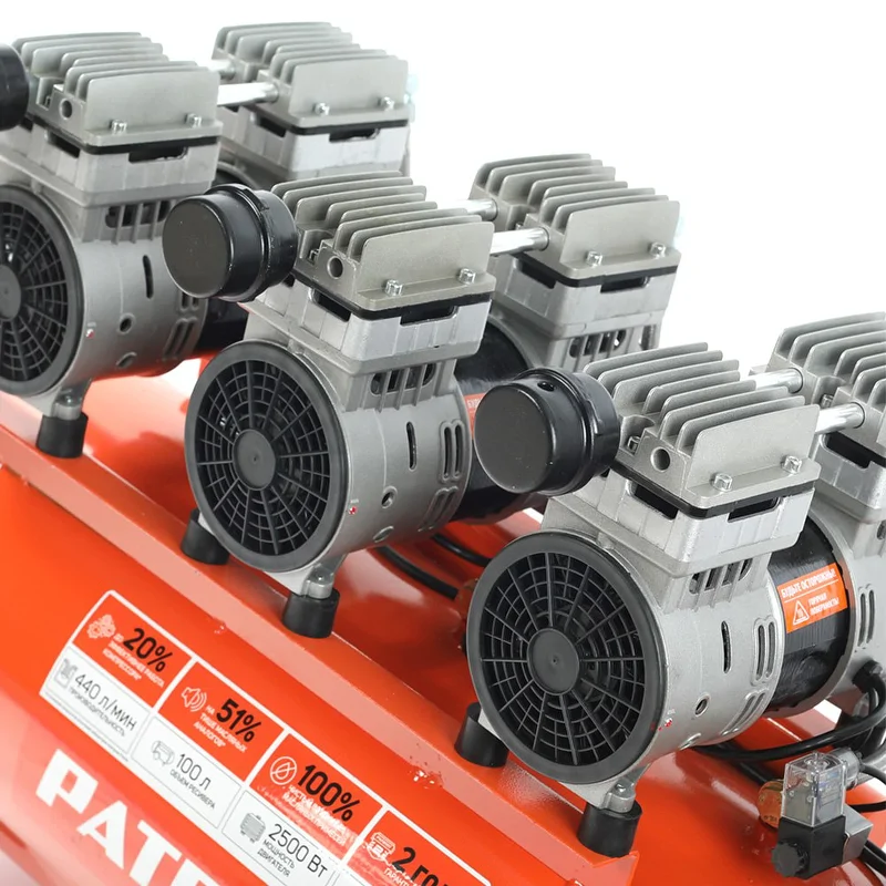 Компрессор Patriot WO 100-440 работает в 2 раза тише, чем аналогичные по мощности модели на масле. За счет этого вам не понадобится повышать голос при разговоре, если вы находитесь в помещении с работающим агрегатом. Помимо этого, за счет безмасляного типа модель можно перевозить и хранить в любом положении.