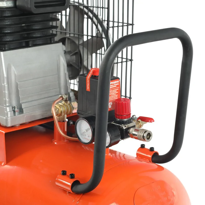 После запуска двигателя прессостат автоматически поддерживает работу компрессора, включая и отключая нагнетание воздуха. Два манометра позволяют контролировать давление в ресивере и на выходе. Давление на выходе можно изменить с помощью поворотного регулятора.