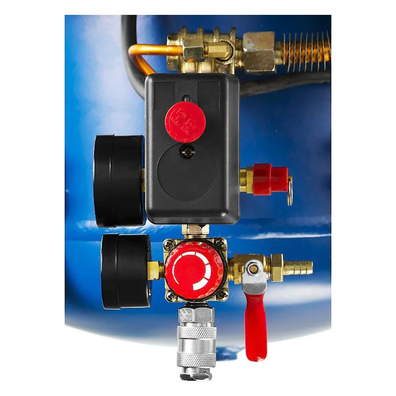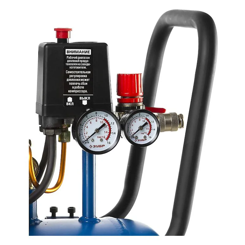 Давление на выходе и в ресивере можно отслеживать при помощи 2 соответствующих манометров.