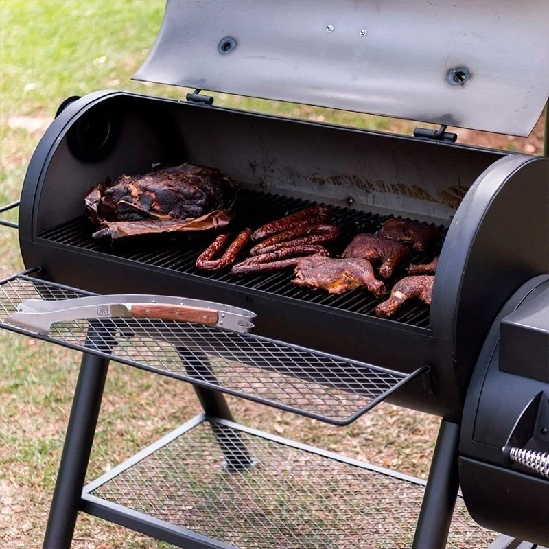 При необходимости гриль переоборудуется в офсетный смокер. Для этого достаточно снять пластины и переставить вытяжную трубу. Если вы - уже опытный пользователь, то в этом режиме будете регулировать температуру и скорость обработки отдельных участков продуктов, ориентируясь по «горячим точкам». Такая офсетная модель удобна, когда имеете дело с большими кусками мяса и хотите добиться аромата барбекю и вкуса «дымка».