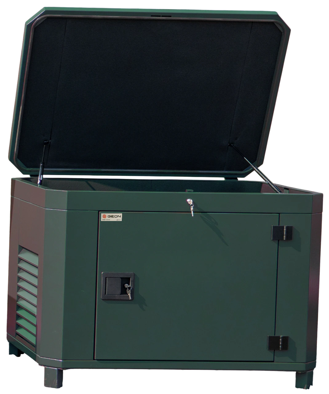 Кожух GEON Premium 1200 в комплектации Winter предназначен для использования электростанций до 9 кВА круглый год, с помощью регулировки температуры и обеспечивает утепление генератора с помощью электрического подогревателя и охлаждение посредством промышленного вентилятора.