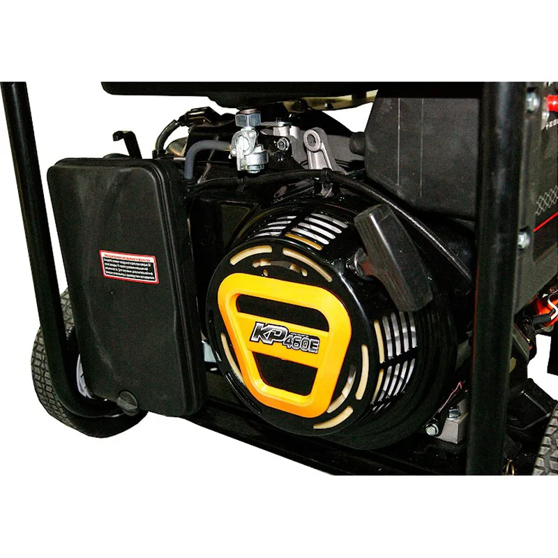 На корпусе бензинового генератора есть несколько розеток для подключения разных потребителей. Предусмотрены два выхода на 220 В, один на 380 В, а также на 12 В для подзарядки автомобильных аккумуляторов. Все розетки оснащены защитными крышечками, которые не позволят попасть влаги, пыли и грязи внутрь.