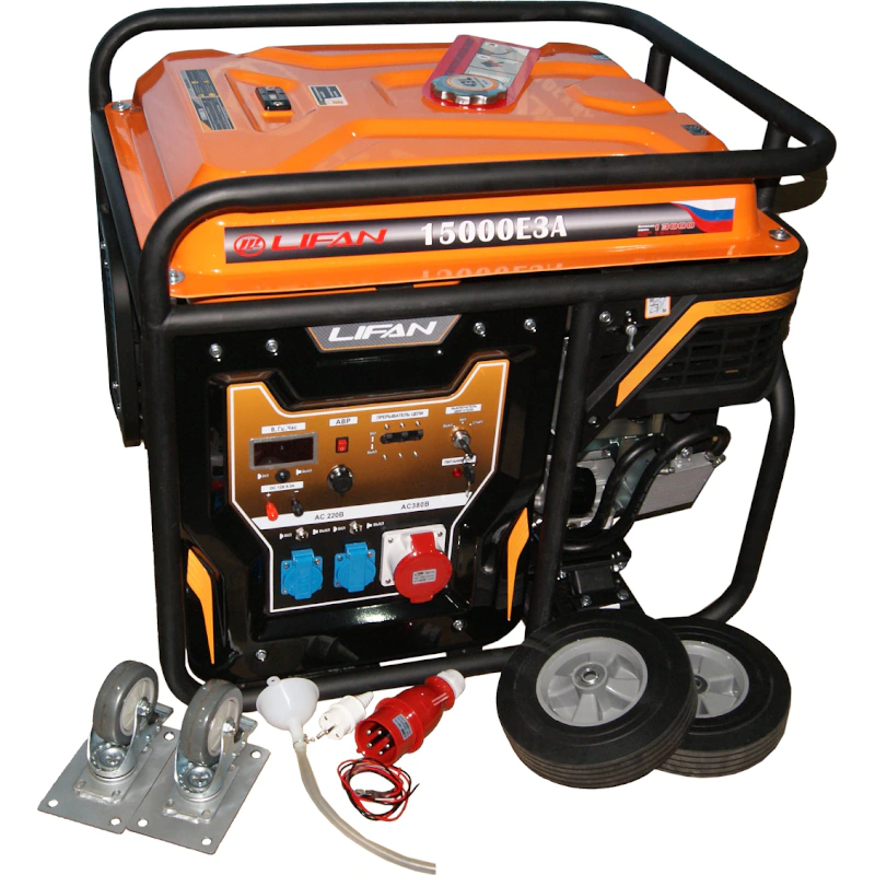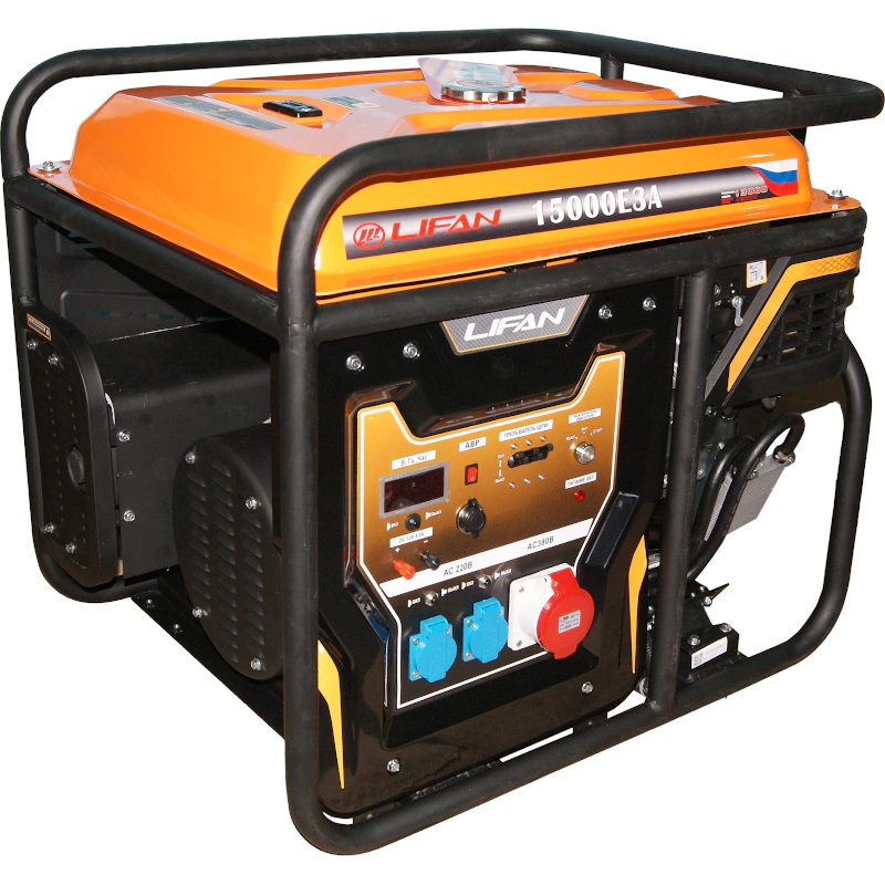 LIFAN 15000E3A - мощный трехфазный бензиновый генератор, применяемый в качестве источника электроэнергии на дорожных и строительных работах, промышленных объектах, на личных загородных участках, в автомастерских, магазинах и в других подобных областях. Исключительная надежность, устойчивость к поломкам и высочайшая производительность делают данную модель одной из лучших на рынке в своем классе электрогенераторов.