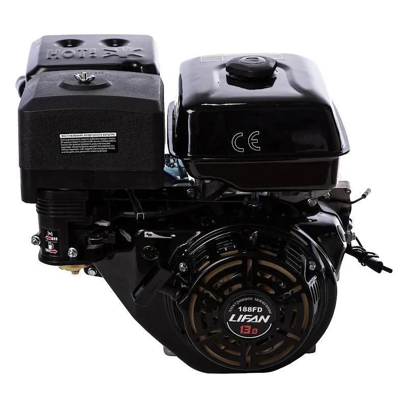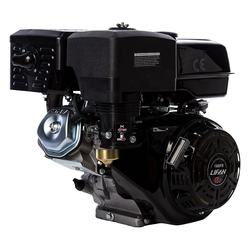 LIFAN 188FD – бензиновый 4х-тактный двигатель для сельскохозяйственной и садовой техники малой мощности: мотоблоков, культиваторов, буксировщиков, пилорам, вездеходов и т.д. Рабочий объём – 389 см3, мощность – 13 л.с. Вал расположен горизонтально. Диаметр – 25 мм. Объём бензобака – 6,5 л, для масла – 1,1 л. Степень сжатия – 8,0:1. Подходит к широкому спектру устройств – от мотопомп до пилорам.
