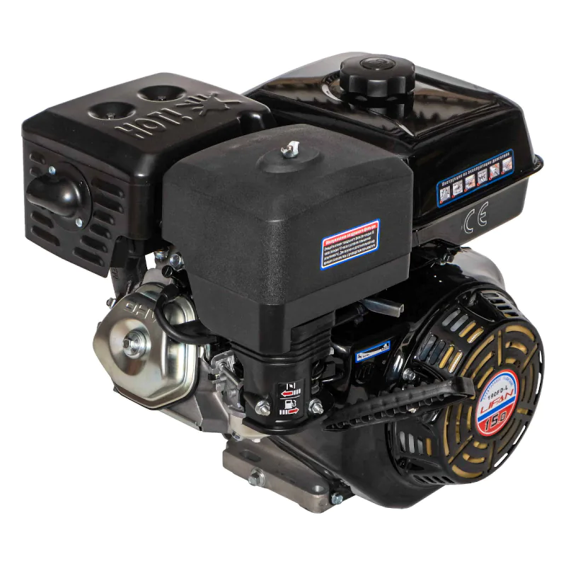 Бензиновый двигатель Lifan 190 FD- L разработан для установки на мототехнику различного уровня. Двигатель хорошо подходит для установки на культиваторы и мотоблоки, мотобуксировщики, мотопомпы, генераторы и другую технику. Эта модель сочетает в себе долговечность, экономичность с умеренной стоимостью и простотой в использовании. Наличие понижающего редуктора позволяет расширить область применения двигателя. Это четырехтактный одноцилиндровый двигатель внутреннего сгорания. Рабочий объем цилиндра составляет 420 кубических сантиметров. Диаметр цилиндра и тип газораспределительного механизма позволяют обеспечить компактные размеры двигателя, он свободно устанавливается на многие модели малой сельскохозяйственной техники. В качестве топлива эта модель использует широко распространенный автомобильный бензин марки АИ-92, потому проблем с горючим не возникнет. Коленчатый вал имеет горизонтальное расположение, это также способствует небольшим размерам, а кроме того существенно упрощает конструкцию и монтаж силового агрегата на шасси. Крутящий момент достигает 25 Н.м при 3600 оборотов в минуту, при этом сохраняется высокая стабильность работы и небольшой расход бензина. Емкость топливного бачка равна 6,5 литрам, одной заправки достаточно для длительной непрерывной работы. В качестве смазки используется доступное и известное каждому автомобилисту моторное масло 10х30, 10х40 для одной заправки маслом требуется не более 1,1 литра. Транзисторная система зажигания проста в обслуживании и долговечна, она способствует стабильной работе двигателя при любых условиях. Двигатель Lifan 190 FD-L обладает массой в 36 килограмм, это легковесный и компактный агрегат, он способен обеспечить высокую продуктивность работы при минимальных затратах и потерях. Его простая конструкция не создаст проблем при установке или при обслуживании, использование эффективного воздушного охлаждения позволяет активно использовать мотор даже в жаркую погоду, удобный пусковой тросик обеспечивает легкий запуск двигателя.
