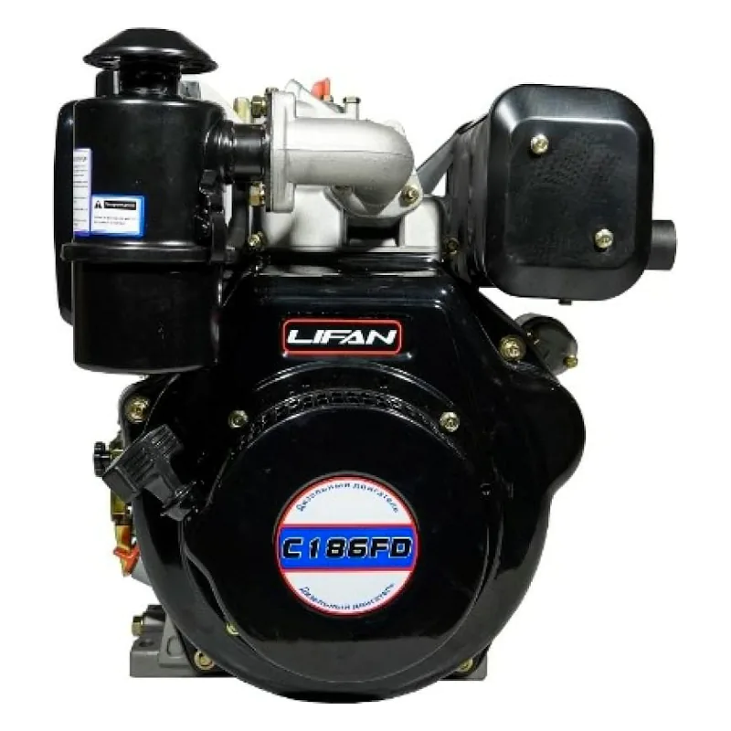 Двигатель Lifan 186 FD обладает массой в 46 килограмм, это достаточно легковесный и компактный агрегат, он способен обеспечить высокую продуктивность работы при минимальных затратах и потерях. Его простая конструкция не создаст проблем при установке или при обслуживании, использование эффективного воздушного охлаждения позволяет активно использовать мотор даже в жаркую погоду, удобный пусковой тросик и система декомпрессии, обеспечивают легкий запуск двигателя.