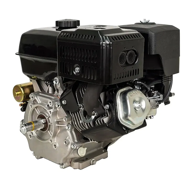 Данный двигатель имеет горизонтальный вал, воздушное охлаждение, ручной и электрический старт. На двигателе установлен глушитель и классический воздушный фильтр. На корпусе воздушного фильтра стоит праймер подкачки топлива для легкого запуска двигателя.
