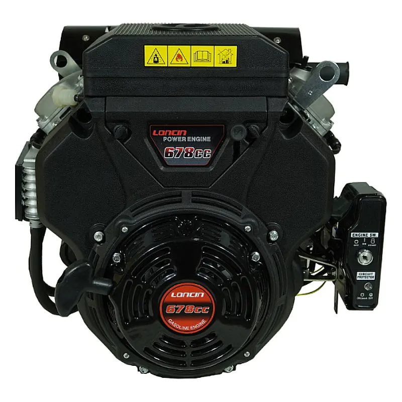 Двухцилиндровый двигатель, объем 678 куб.см, 24 л.с, горизонтальный вал 25 мм, ручной и электрический запуск, катушка освещения 20А.