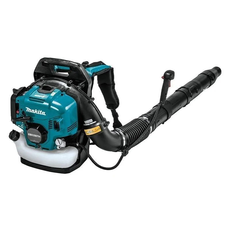 Бензиновая воздуходувка Makita EB5300TH с ранцевой конструкцией оборудована 4-тактным двигателем и топливным баком объемом 1,8 л. Поставляется в комплекте с длинной и плоской насадками, 2 наконечниками диаметром 60 мм и 70 мм, а также гибкой и жесткой трубками.