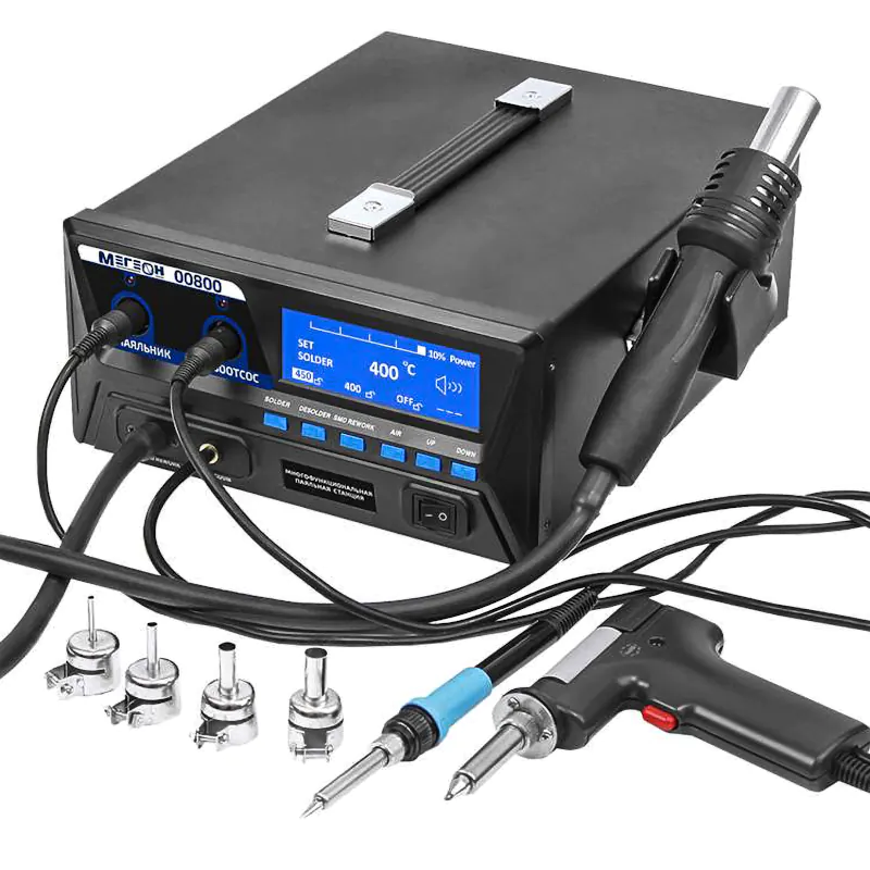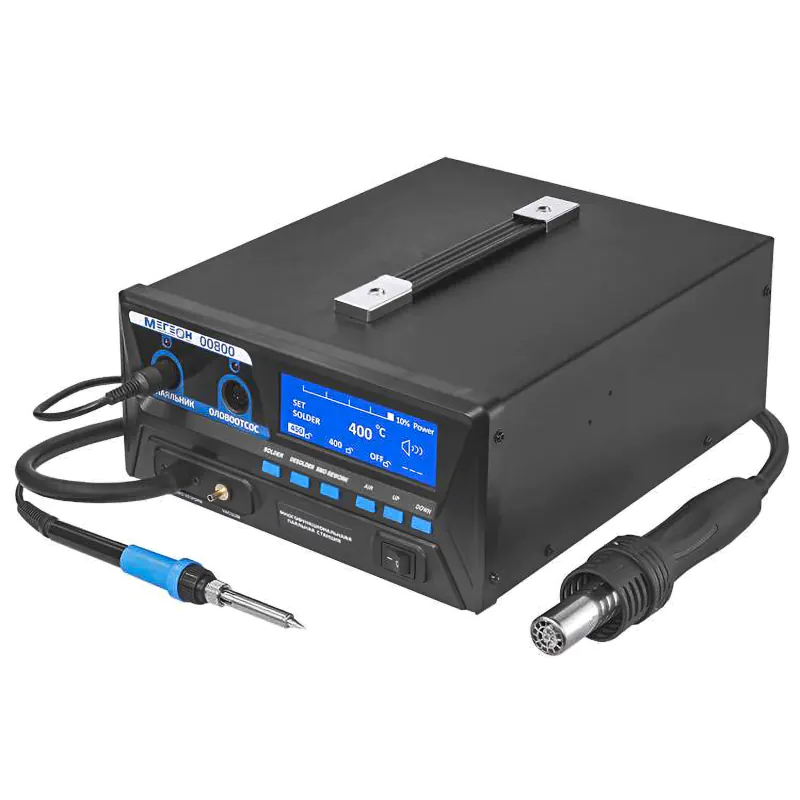 Многофункциональная паяльная станция МЕГЕОН 00800 представляет собой качественный и современный радиомонтажный инструмент. Данная станция оснащена термофеном, что позволяет использовать её для монтажа и пайки различных электронных компонентов. Наиболее часто, данная паяльная станция используется для работы с термоусадками, удаления стикеров и краски, предварительного нагрева поверхностей и предметов. Благодаря использованию современных компонентов и схем питания, паяльная станция отличается высокой стабильностью и надежностью.