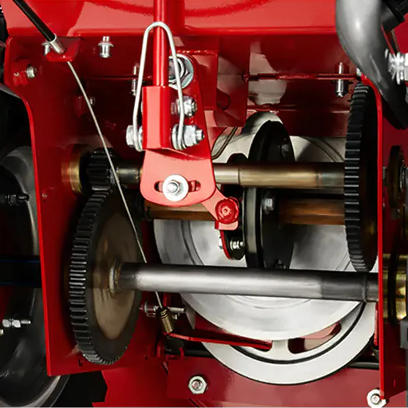 Шестеренчатая трансмиссия обеспечивает широкий выбор скоростей движения — пять передних передач и две задние. При уборке тяжелого мокрого снега и на неровной поверхности с буграми удобно работать на пониженной передаче до 0,63 км/ч. Большие колеса с глубоким рельефным протектором обеспечивают отличное сцепление со снежным покрытием.