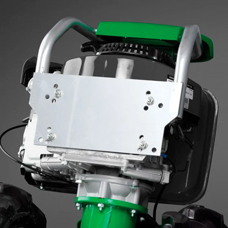 Двигатель бензинового мотоблока оснащен защитной конструкцией. Она состоит из прочной рамы и крышки. Конструкция изготовлена из прочной стали, которая не позволяет камням, вылетающим из-под колес, ударять по мотору. Сверху нанесено специальное покрытие для большей защиты.