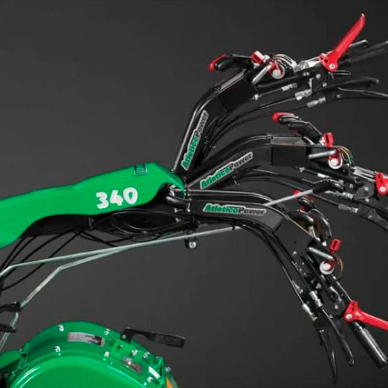 Бензиновый мотоблок Caiman Atletico 340PT – многофункциональный двухколесный трактор с профессиональным бензиновым двигателем Honda мощностью 11,7 л.с., реверсивной рукояткой управления, гидравлическим сцеплением PowerSafe®, блокировкой дифференциала, независимыми рабочими тормозами, шириной обработки почвы до 80 см (в зависимости от выбора навесного приспособления).