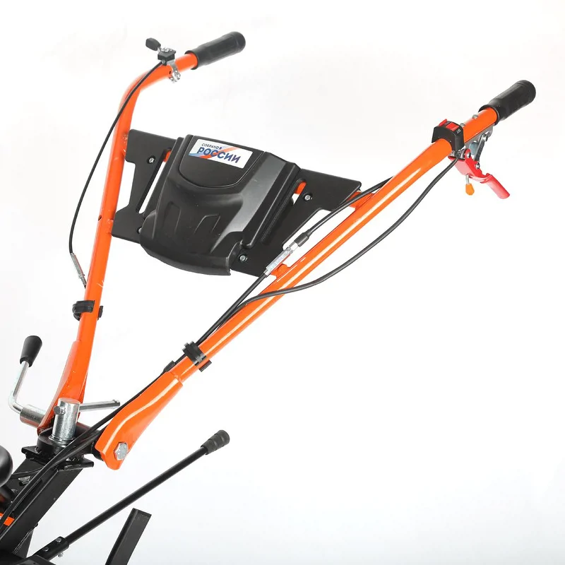 Для удобного использования предусмотрена складная рукоятка с функцией вертикальной регулировки. Резиновые накладки на ручках обеспечивают комфорт при продолжительных работах.