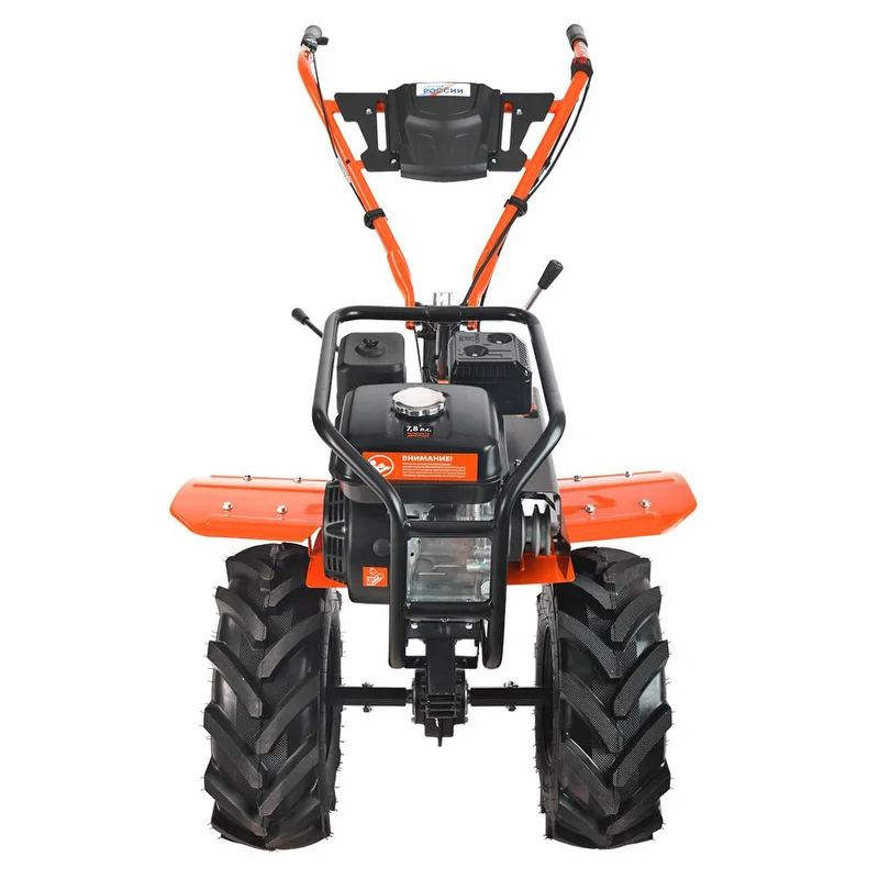 Прочный цепной редуктор из чугуна позволяет использовать разнообразное навесное оборудование: от снегоочистителя до грузовой тележки. Докупаемая оснастка позволит использовать мотоблок в любой сезон. Модель поставляется в комплектации с закаленными фрезами и сошником.