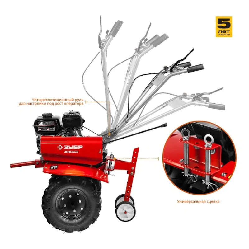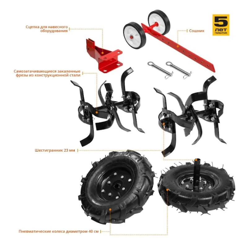 Отдельно можно приобрести плуг, снегоочиститель, щетку, лопату, фронтальную косилку, тележку и другое оборудование. Аксессуары крепятся к мотоблоку и расширяют его функционал.