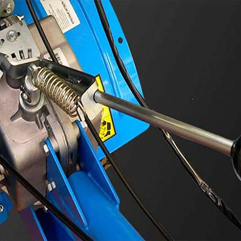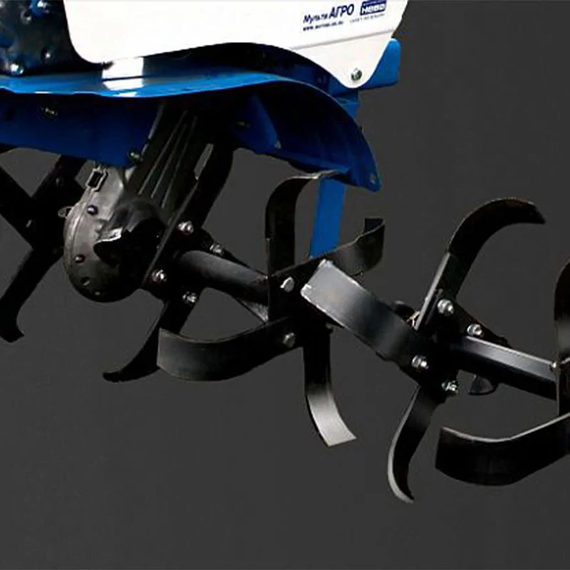 Стальная рама повышает надежность конструкции. Сцепное устройство позволяет подсоединить телегу, плуг, окучник, картофелекопалку и другое сменное оборудование, не требующее активного привода. Тяговое усилие 300 кгс и большие пневматические колеса обеспечивают отличную управляемость и проходимость мотоблока как отдельно, так и с установленными механизмами и устройствами. Для наиболее комфортной работы рукоятки руля можно регулировать независимо друг от друга.