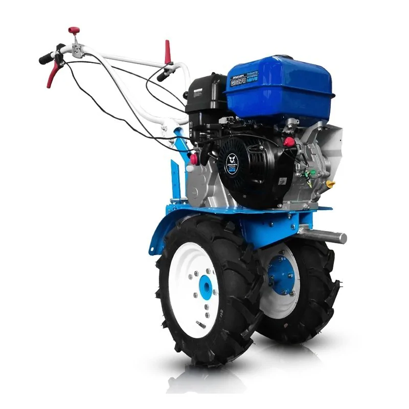 Бензиновым мотоблоком комфортно управлять. Рукоятки оснащены резиновыми накладками, которые препятствуют скольжению, обеспечивая крепкий хват. Большие колеса позволяют легко проходить неровности и кочки на участке. С управлением справится даже пожилой человек.