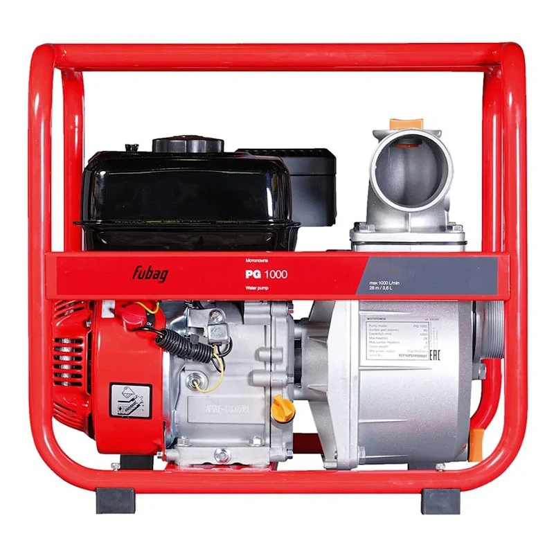 Мотопомпа для чистой воды Fubag PG 1000 производительностью 1000 л/мин предназначена для пожаротушения, перекачки и набора чистой воды в резервуары, бассейны или декоративные пруды, оперативной ликвидации последствий паводков и половодий. Допускается наличие примеси абразивных частиц размером до 4 мм. Максимальная высота всасывания составляет 8 м, высота напора — 26 м. Устройство можно эксплуатировать при температуре окружающего воздуха от -40°С до +40°С. Время работы на одной дозаправке составляет 3,3 часа.
