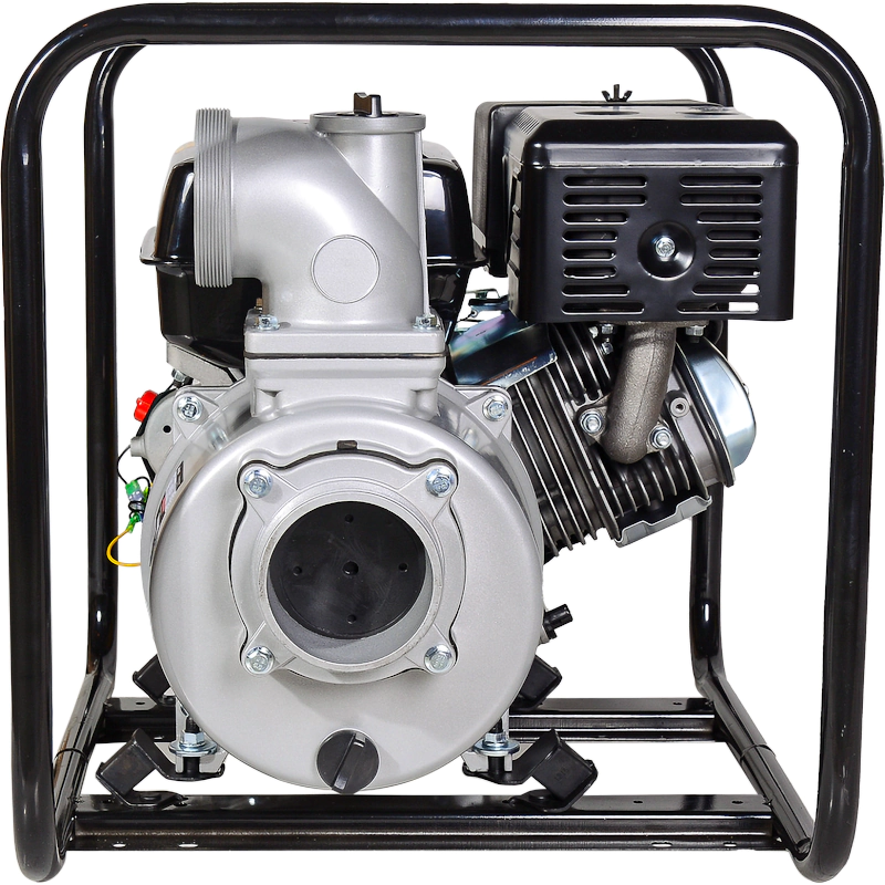 Опорная рама из прочной стальной трубы обеспечивает устойчивое положение бензиновой мотопомпы и служит защитой от внешних воздействий. Амортизирующие элементы снижают вибрации. Четырехтактный двигатель мощностью 13 л.с. без проблем заводится с помощью ручного стартера в любых погодных условиях. Эта модель является самой мощной в линейке мотопомп Huter.